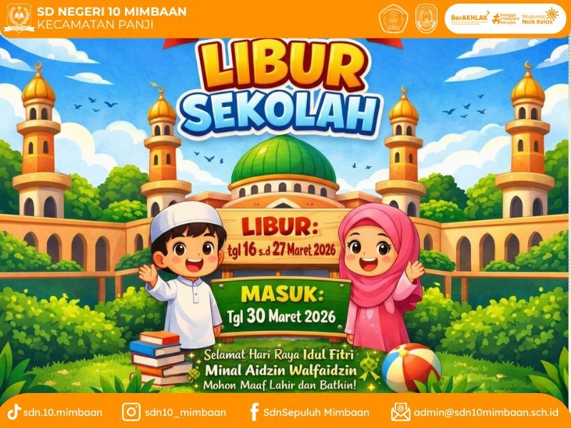 Berdasarkan Surat Dinas Pendidikan dan Kebudayaan Kabupaten Situbondo, Nomor : 400.3/01290/431.301/2026 Tanggal 13 Februari 2026 perihal Pemberitahuan Libur Awal Puasa dan Kegiatan Selama Ramadhan Serta Libur Sekitar Hari Raya Idul Fitri 1447 H / 2026 M. Bahwa tanggal 16 s.d 28 Maret 2026 kegiatan pembelajaran di SD Negeri 10 Mimbaan diliburkan dan siswa masuk kembali pada tanggal 30 Maret 2026. Sehubungan dengan libur Idul Fitri ini, kami turut menghimbau kepada siswa untuk mengisi masa liburan dengan belajar mandiri dan kegiatan yang positif di rumah dengan pantauan orangtua / walimurid, serta orangtua/wali murid untuk menjaga keamanan, kesehatan, dan keselamatan selama liburan.